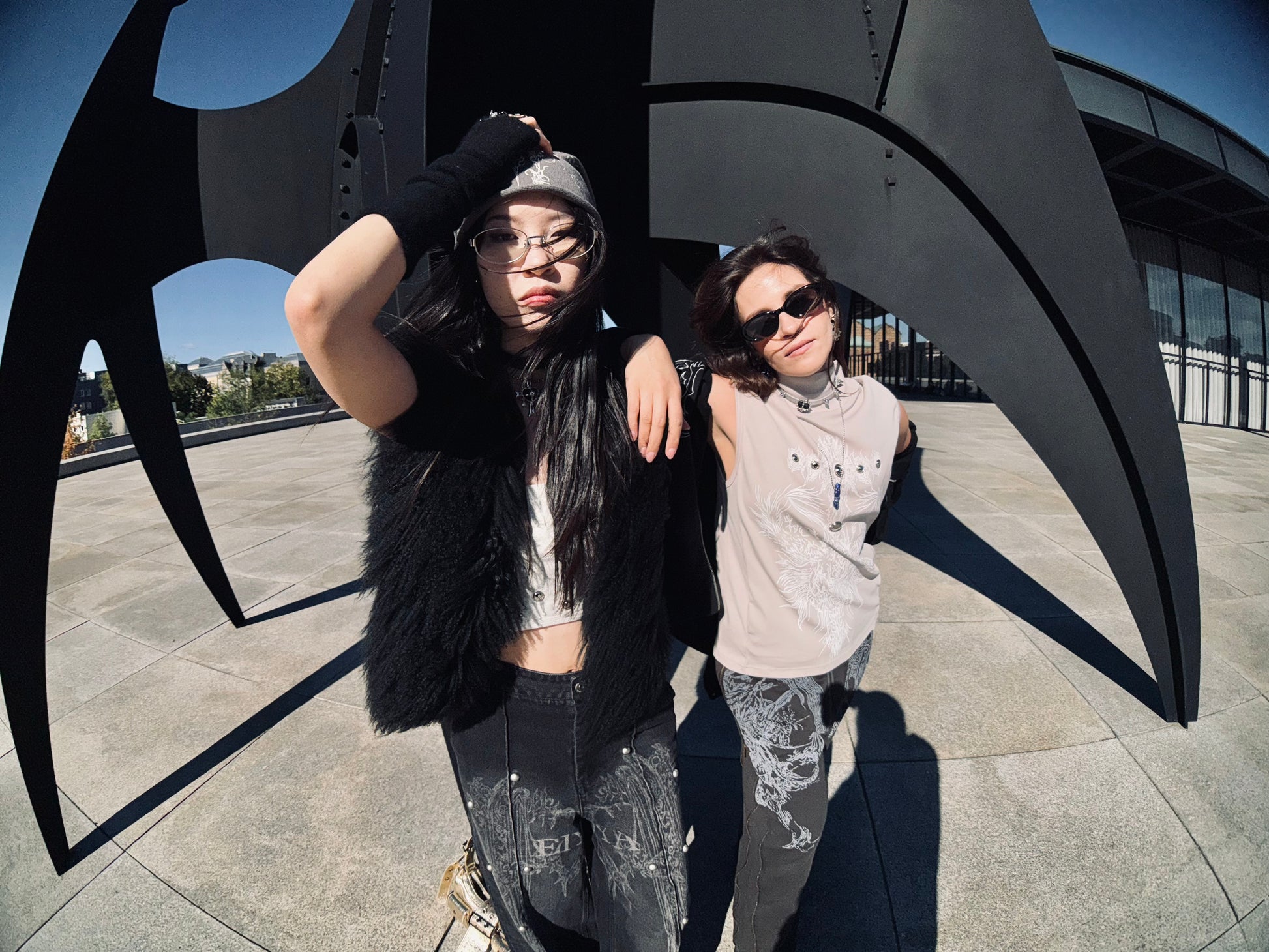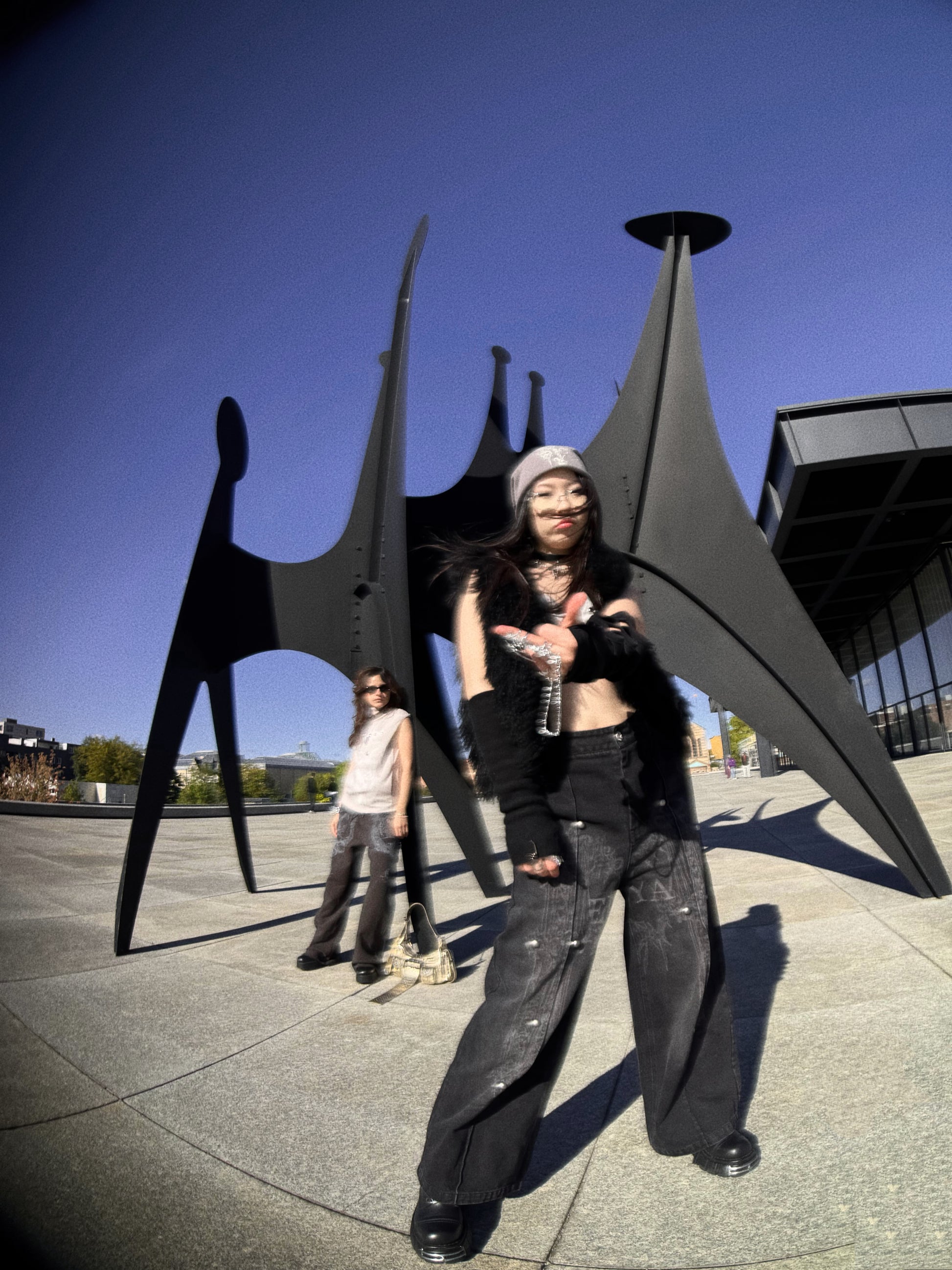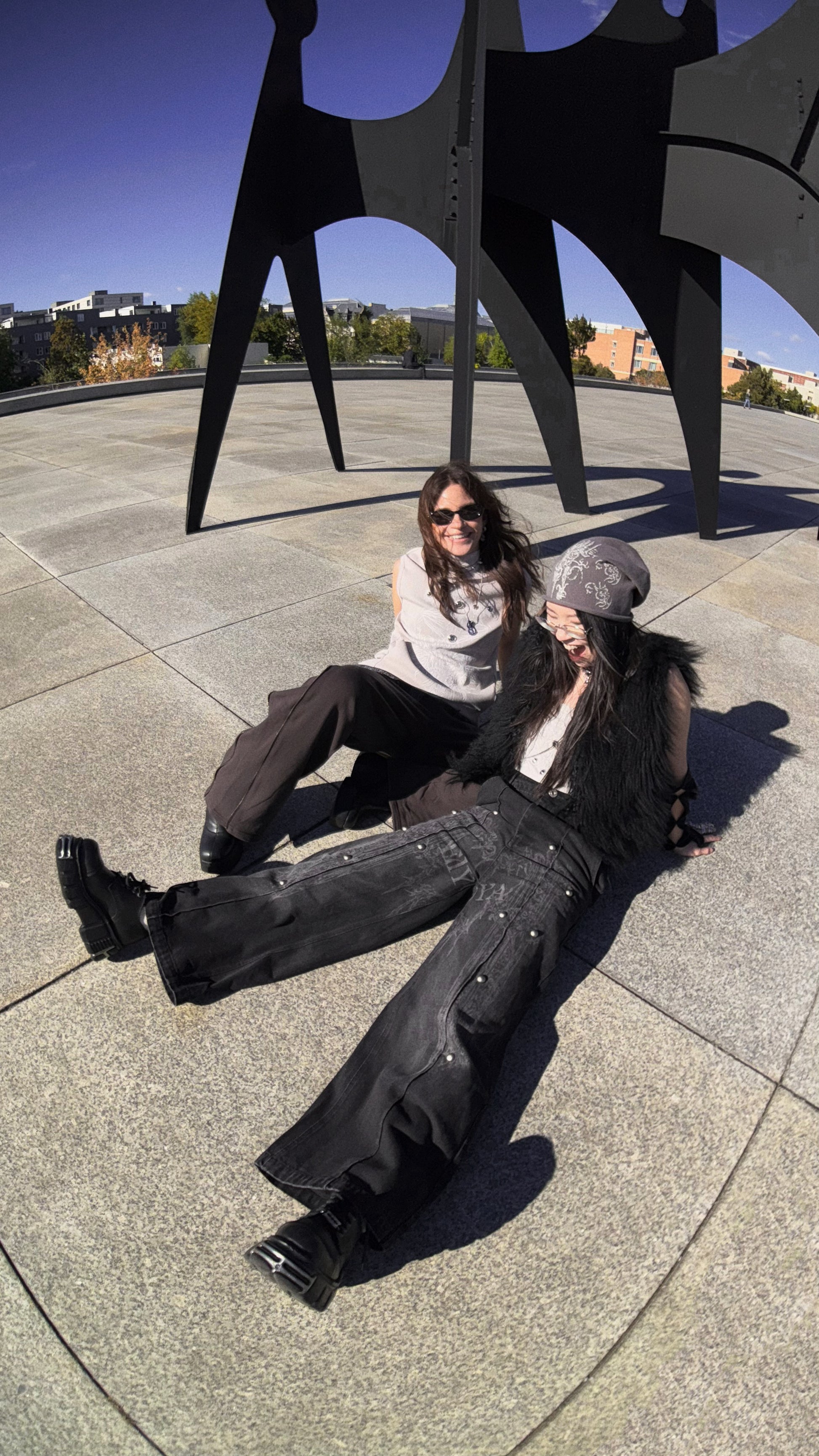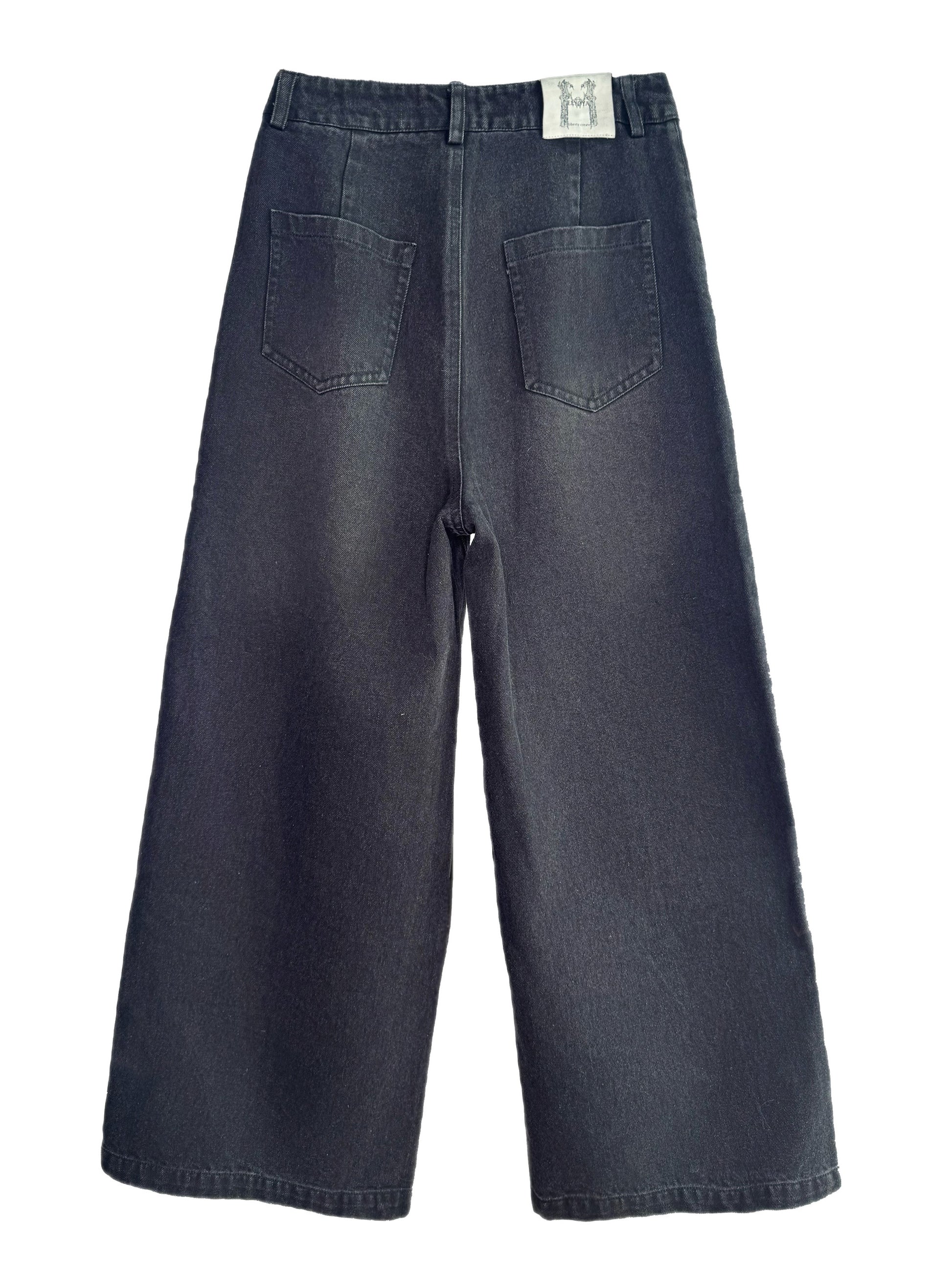 Black wide-leg denim with engraved graphic detailing and pearl stud accents along the front. High-rise fit and relaxed silhouette for an edgy yet refined look.