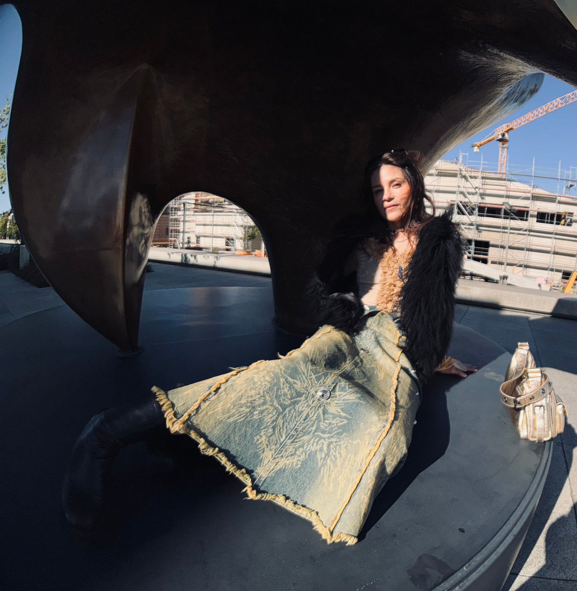 A-line denim maxi skirt featuring bold dragon engravings, raw yellow seam details, and front button accents. High-waist cut and flowing silhouette.